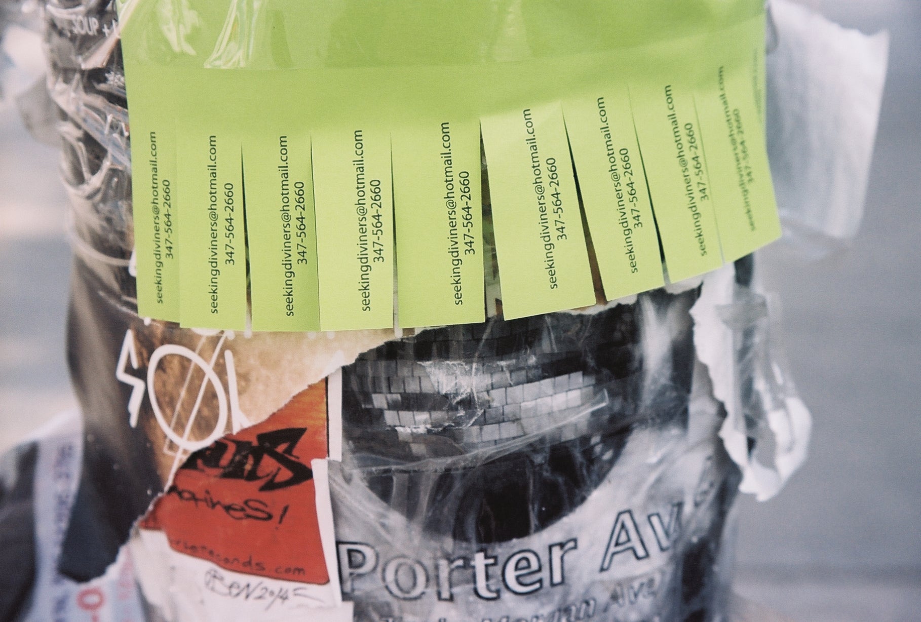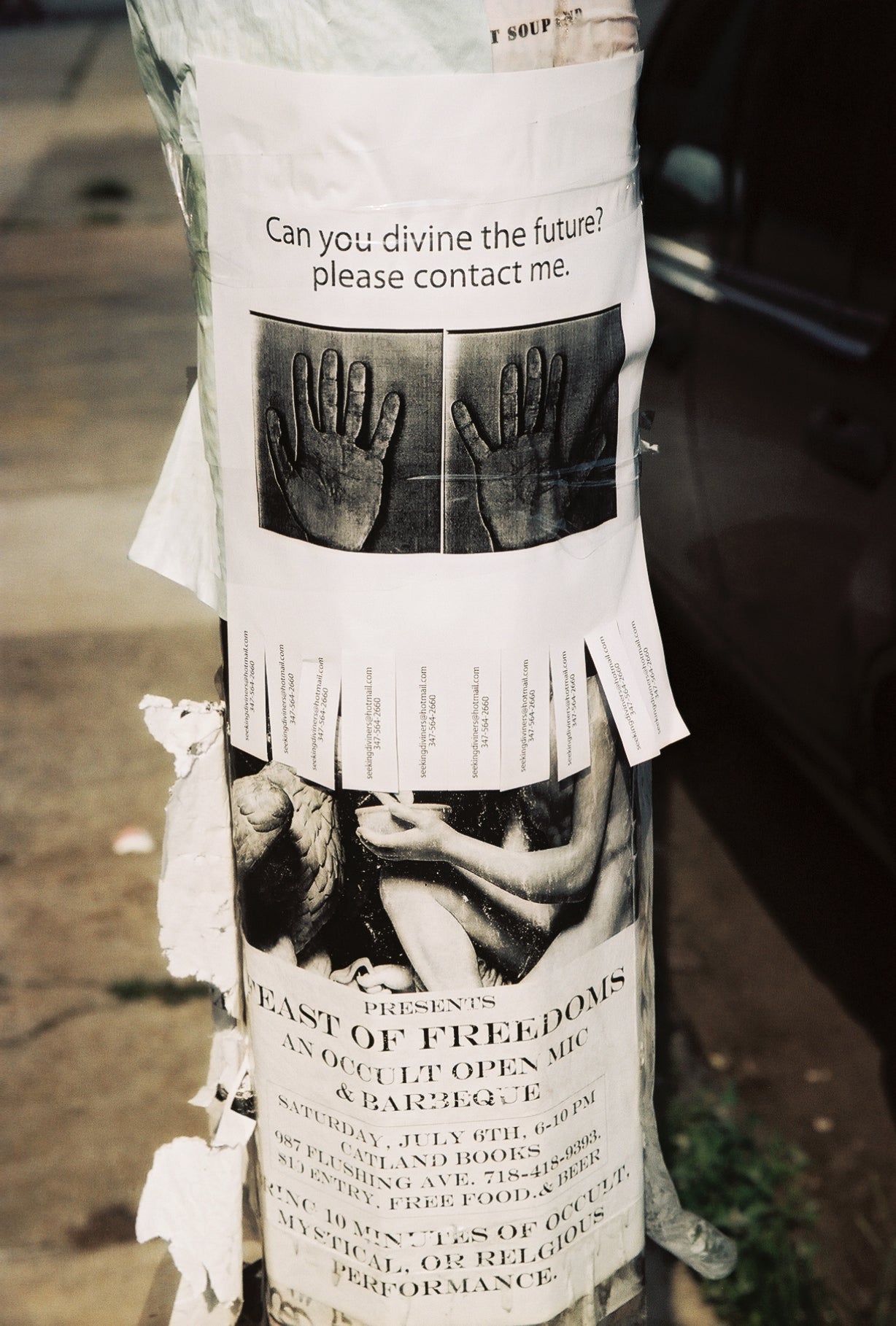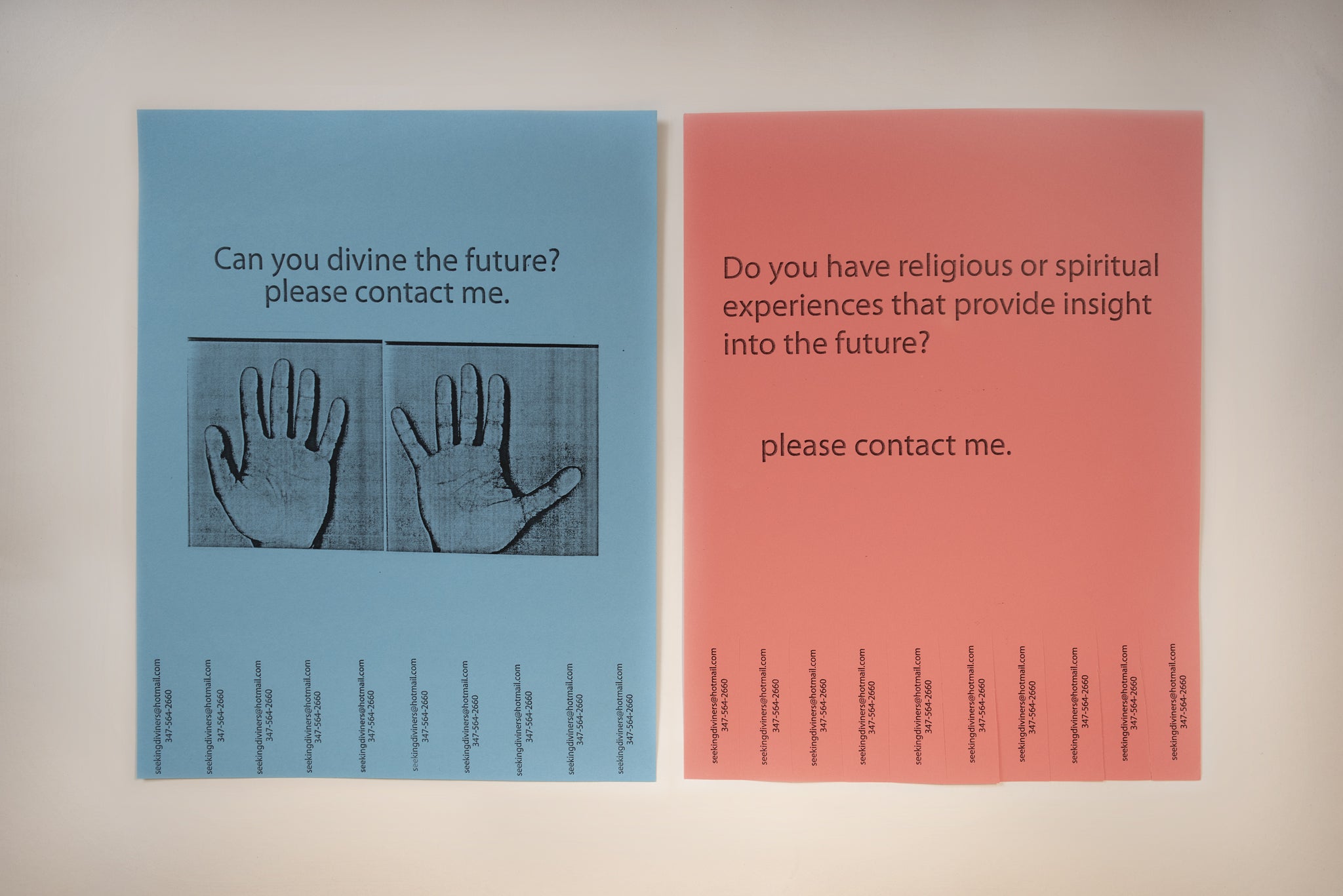 Each flyer had tear-offs with a phone number and an email. Some of the responses received were pessimistic and trolling. Others were sincere, coming from individuals initiated in a variety of traditions that celebrate divination as a means of counsel and contemplation.