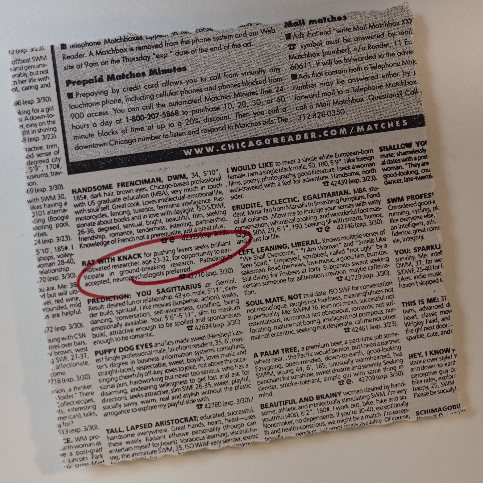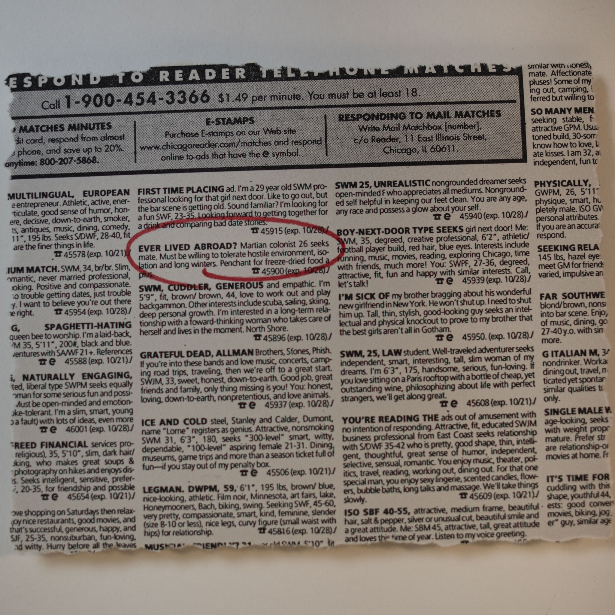 With this public intervention, the artist explores dating at the end of the 20th century, placing three different personal ads in the Chicago Reader.