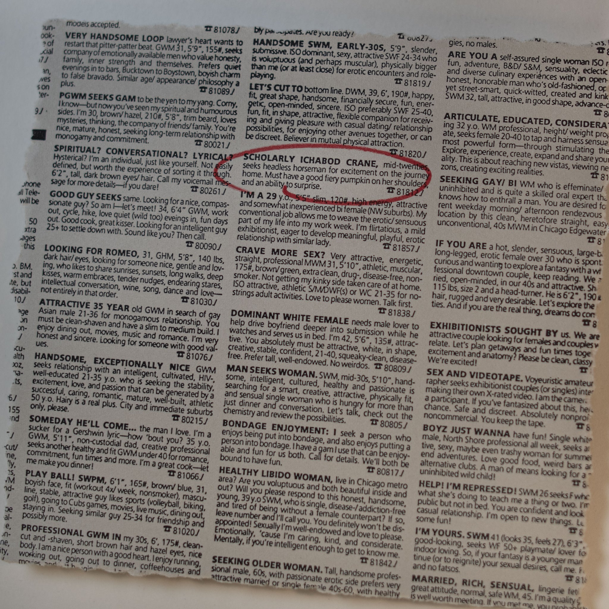 While living in Chicago during the summer of 1999, artist James Leonard placed three different personal ads in the Chicago Reader. These ads simultaneously revealed quirks of his desires, while cloaking other aspects of his personality in enigma.