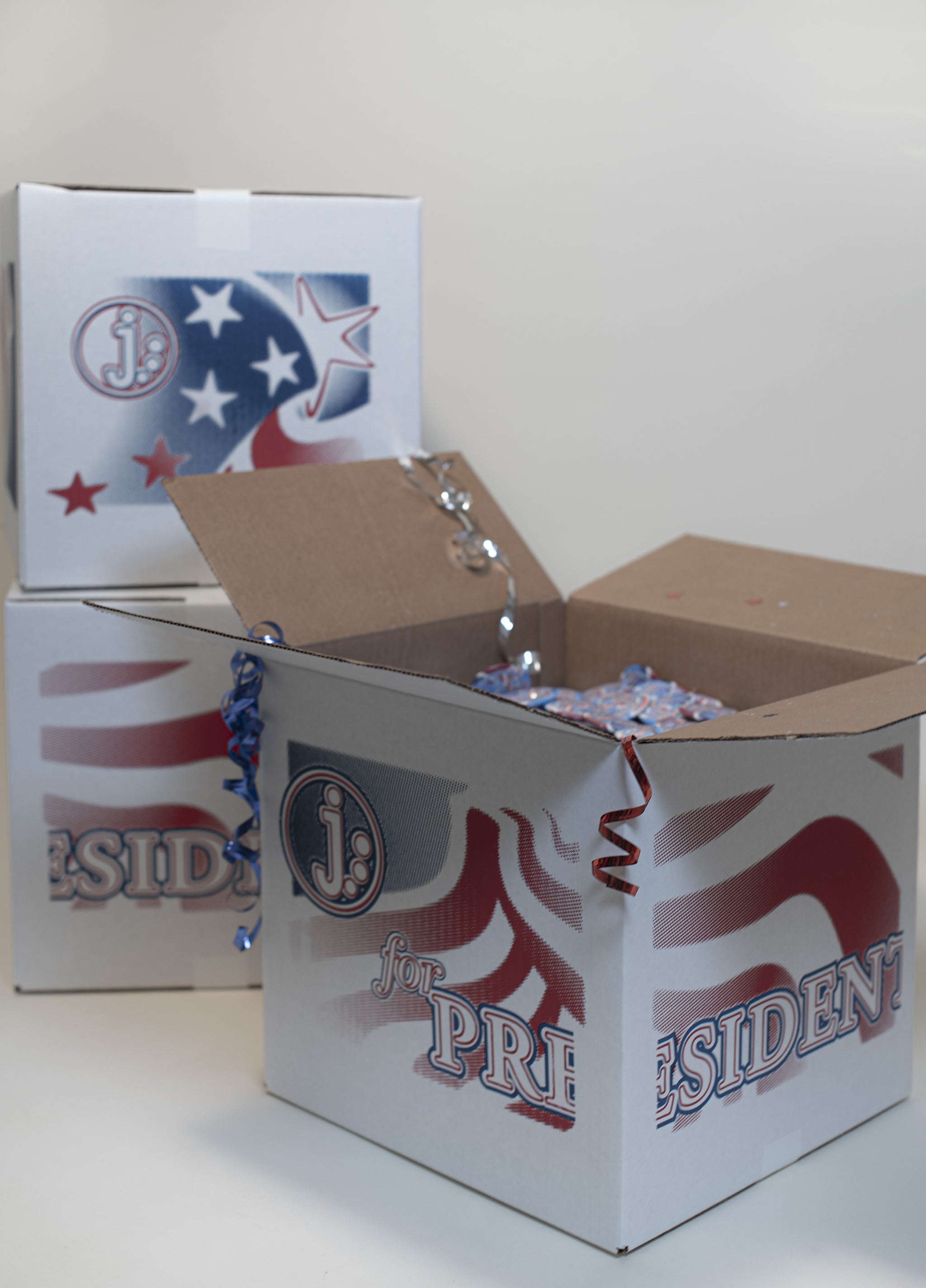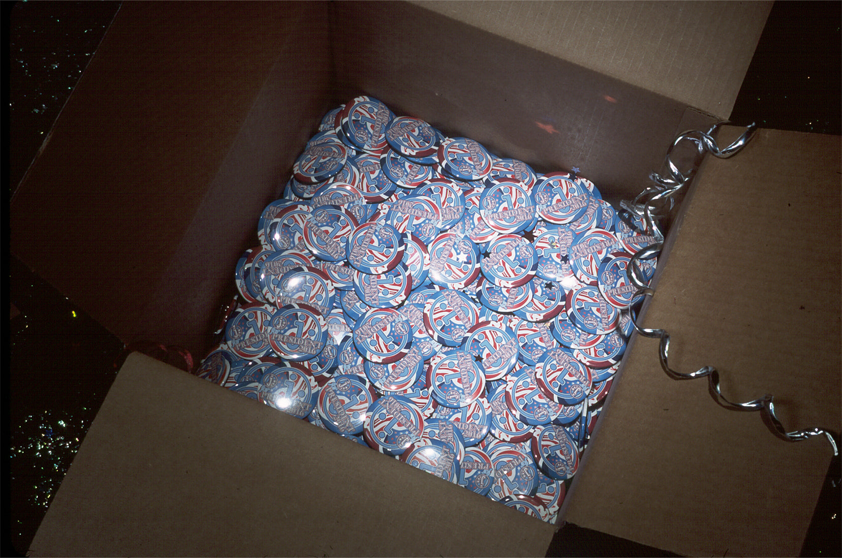 This installation consists of three repeated elements: screen-printed boxes, campaign buttons, and mylar confetti. The boxes sit on the exhibition space floor, each filled with campaign buttons facing upward. The graphics feature a logo long-used by the artist as both signature and brand identity, along with the text, “for President 2016.” Red, white, and blue mylar confetti and streamers litter the scene.