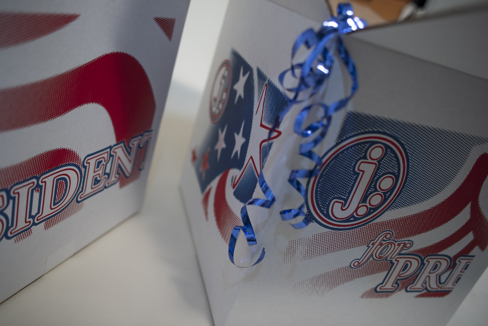 Serigraph on cardboard, campaign buttons, mylar confetti