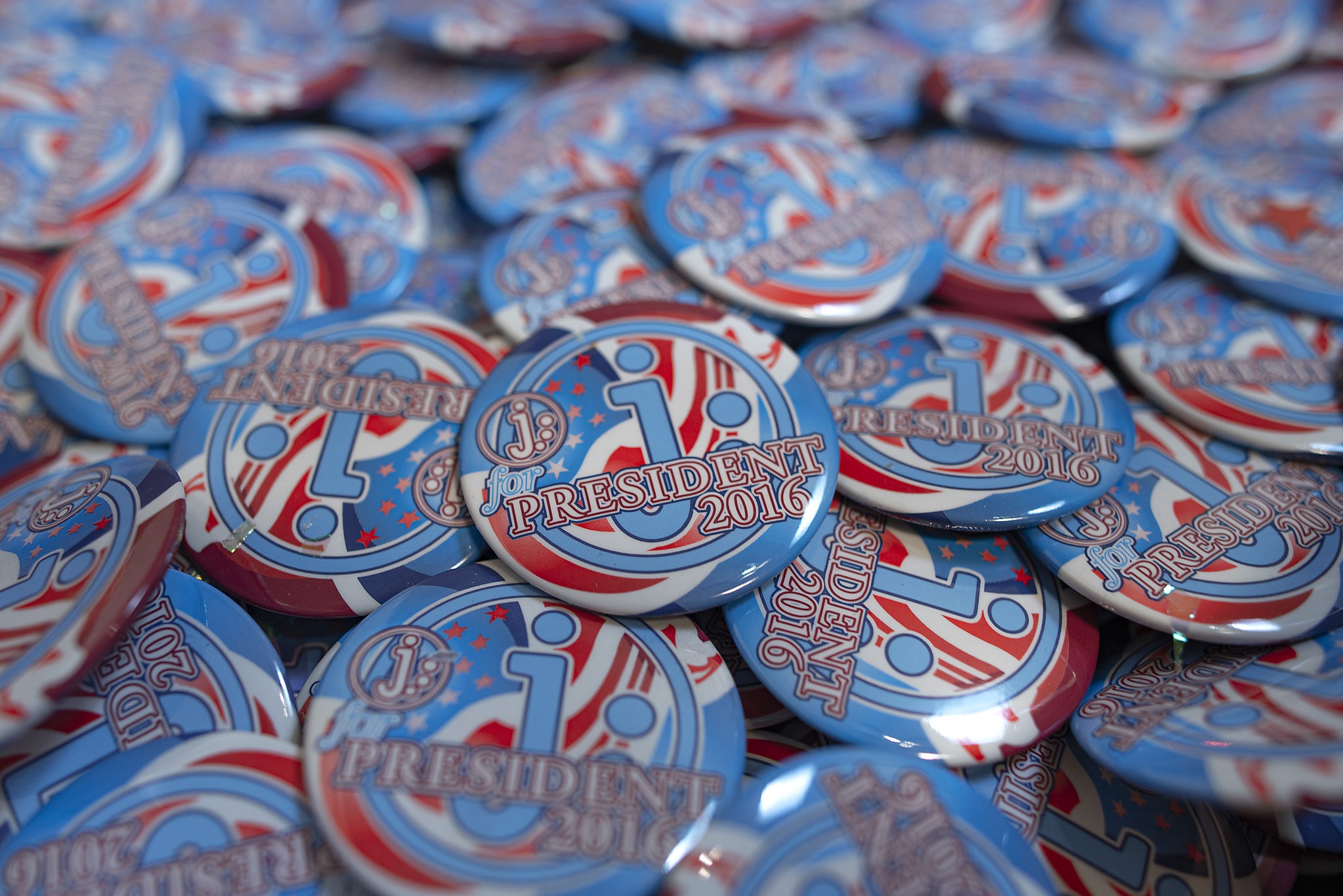 Manufactured artifacts imply the artist ran an unsuccessful campaign for president in the year 2016.
