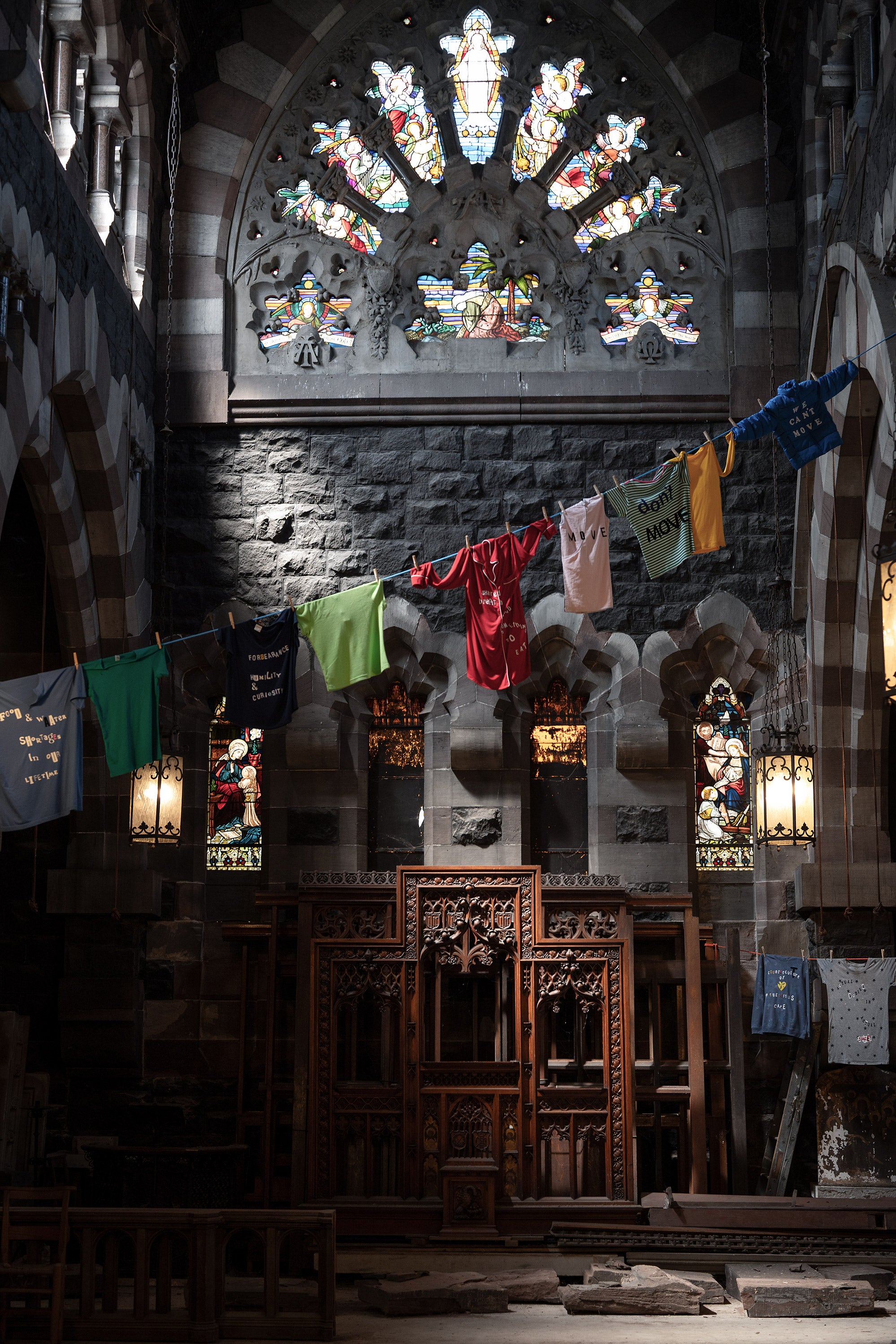This project is currently a work-in-process. It is suitable for both traditional gallery contexts and site-specific installations. In 2025, The T-Shirt Shop at the End of Civilization appeared in the derelict cathedral space of The Church of the Holy Innocents in Hoboken, NJ. The project consists of an ever-growing collection of unique garments, currently exceeding 250.